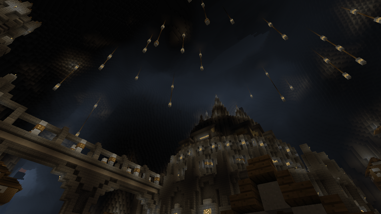 とりあえず地下の空洞を広げて街っぽくできればいいや程度の目標だったので、住居がすごく簡素です。真っ暗だと見せるものも見せられないので光源を設置して明るさを確保。動いている黒い物体はコウモリです。雰囲気付けに。