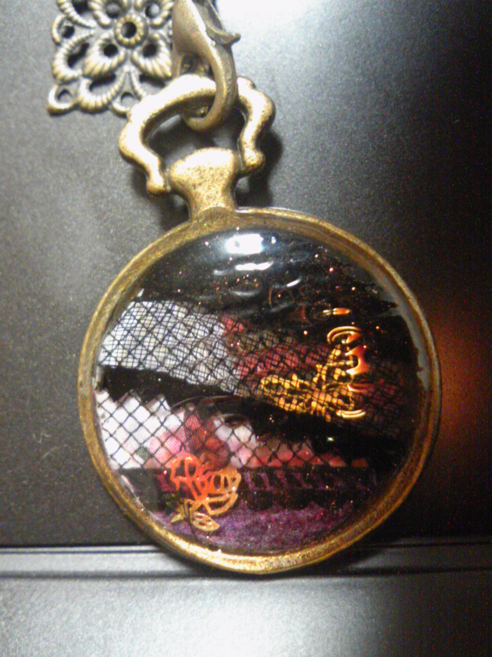 右半分は内部が見づらいですが、黒いレースの下に金の蝶々が入っております。夜の蝶々…(意味深)