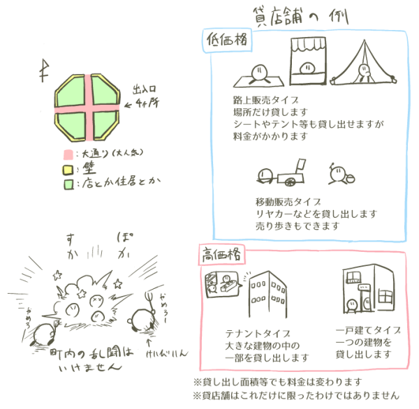 町の中にある店のうち半分ぐらいは貸店舗で、自分の店を持っていない一般人でも店を開くことができる。
